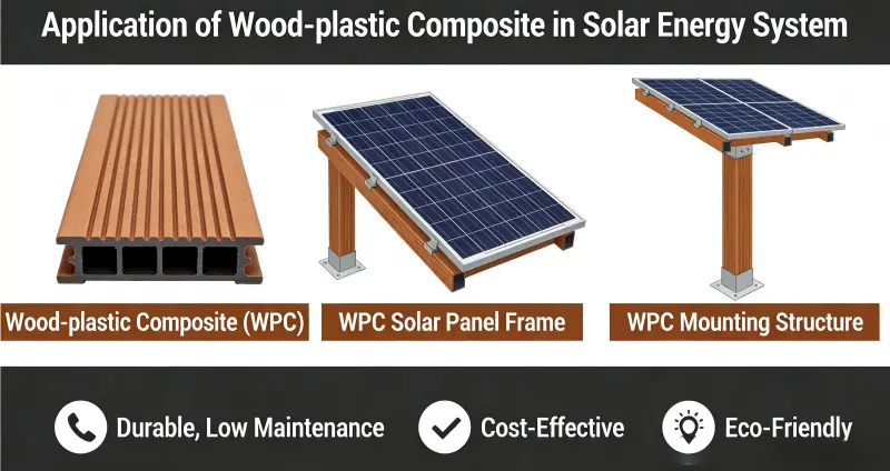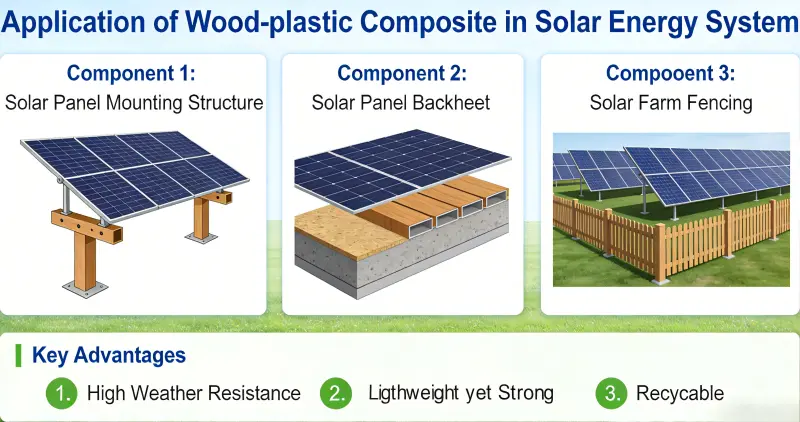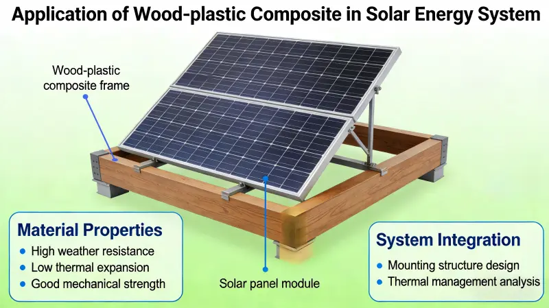 Древесно-пластиковый композит (ДПК) стал ключевым материалом в солнечных энергетических системах, включая фотоэлектрические (PV) крепления, плавучие электростанции, интеграцию фотоэлектрических зданий и хранение концентрированной солнечной энергии (CSP), благодаря своим экологически чистым, атмосферостойким, легким, не требующим особого ухода и простым в обработке свойствам. Он постепенно заменяет традиционные металлические и деревянные материалы.