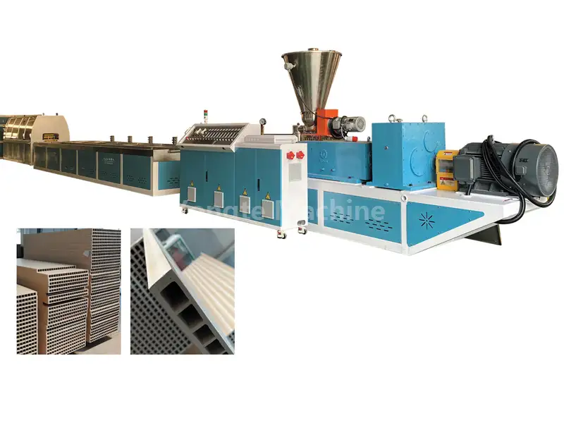 Специально разработанный конический двухшнековый экструдер может эффективно транспортировать древесную муку и смеси ПВХ-смол, быстро пластифицировать материалы, чтобы избежать карбонизации древесной муки или разложения ПВХ, повысить эффективность производства и снизить потребление энергии. Он оснащен серводвигателем для снижения энергопотребления на 15-20%, вертикальным редуктором с прямым приводом с высокой эффективностью трансмиссии и стабильной работой, долговечной и энергоэффективной автоматической системой нагрева и контроля температуры.
